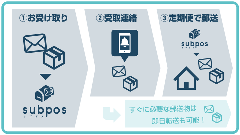 サブポスの住所を使った郵送物は一度サブポスがお預かり、その後、プランに応じた頻度でご自宅に自動転送します。